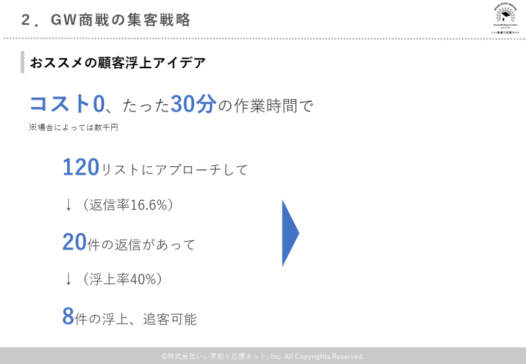 学んでも社内で実施できなければ意味がないので、出来るだけ手間も時間もかからずに実施できる施策をご紹介。もちろんチラシサンプルやLP(申込ページ)のサンプルもお渡ししました。