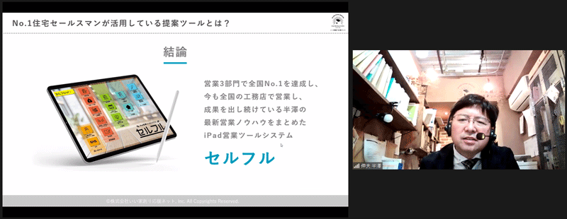 営業3部門で全国No.1を達成したノウハウをベースにした最新の資料や営業ツール、動画やトークスクリプトまですべてが体系化され、新卒新人でも初年度から7棟の契約を実現したiPad営業支援ツール『セルフル』の活用セミナーを開催しました。