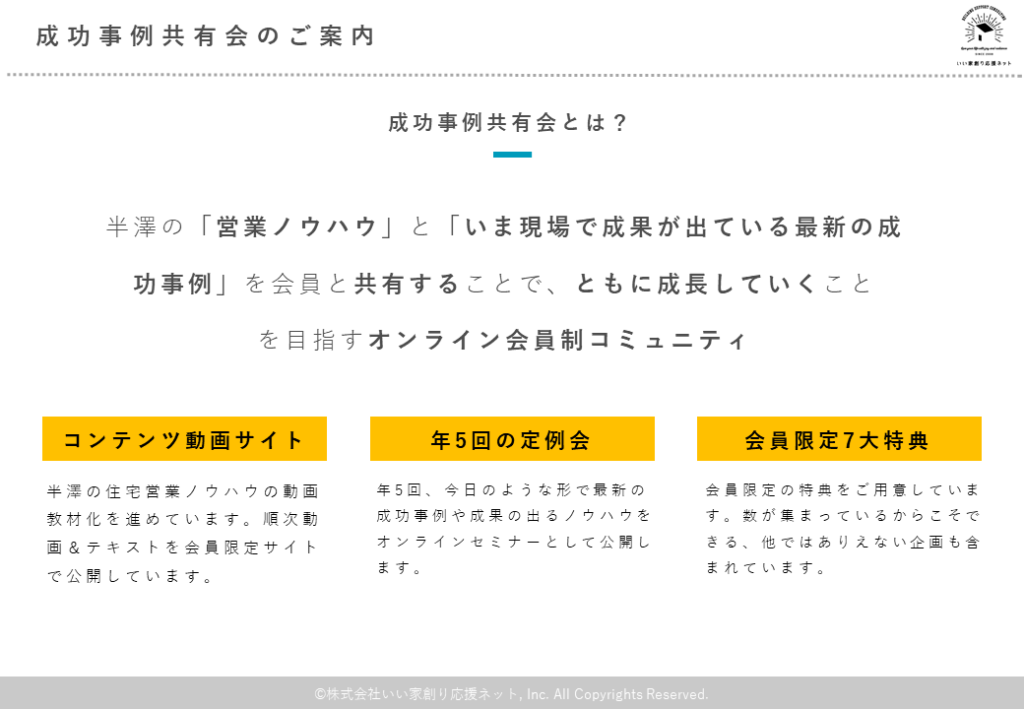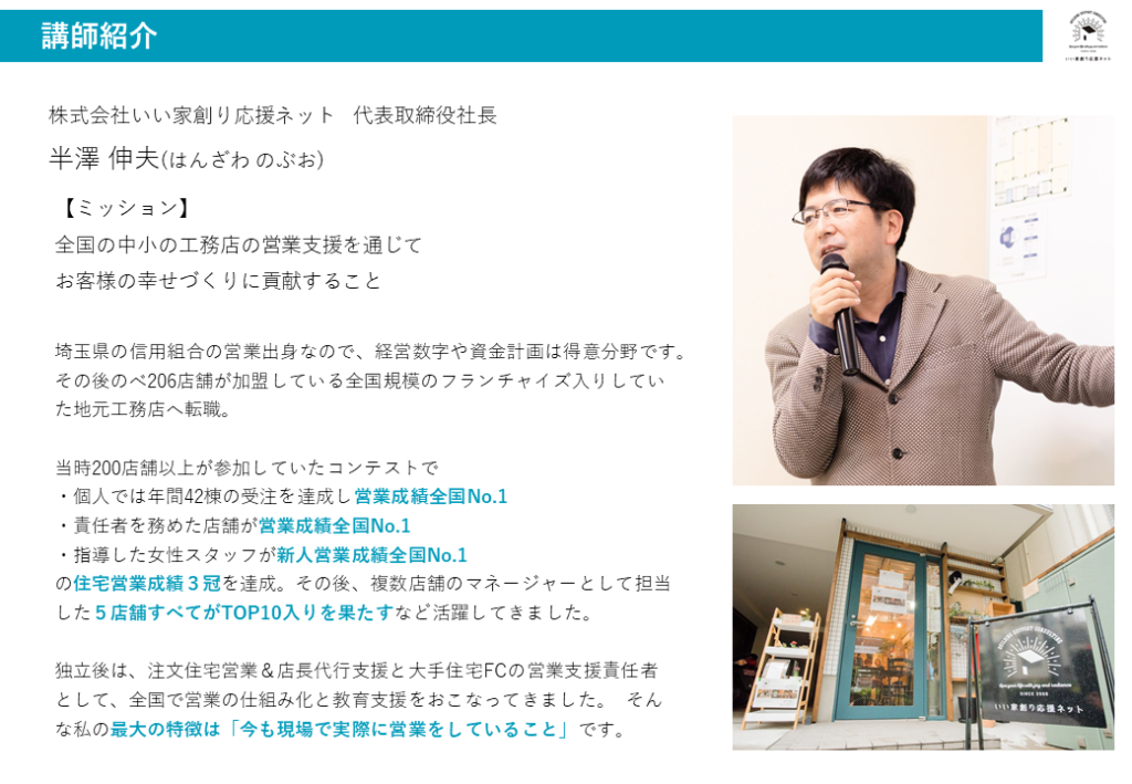 全国206店舗の中で「個人」「店舗」「(未経験の女性)新人部下育成」の営業3部門で全国No.1を達成した経験とノウハウをもとに、今も全国の工務店で営業代行として現場で直接お客様を営業しながらコンサルティングも行っている半澤の最新の住宅営業ノウハウが手に入る、会員制動画教材プラットフォームが成功事例共有会です。