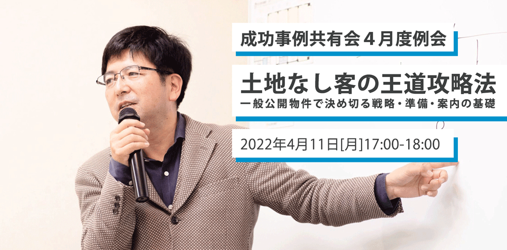 | 開催テーマ | 土地なし客の王道攻略法 ~一般公開物件で決め切る戦略・準備・案内の基礎~ |