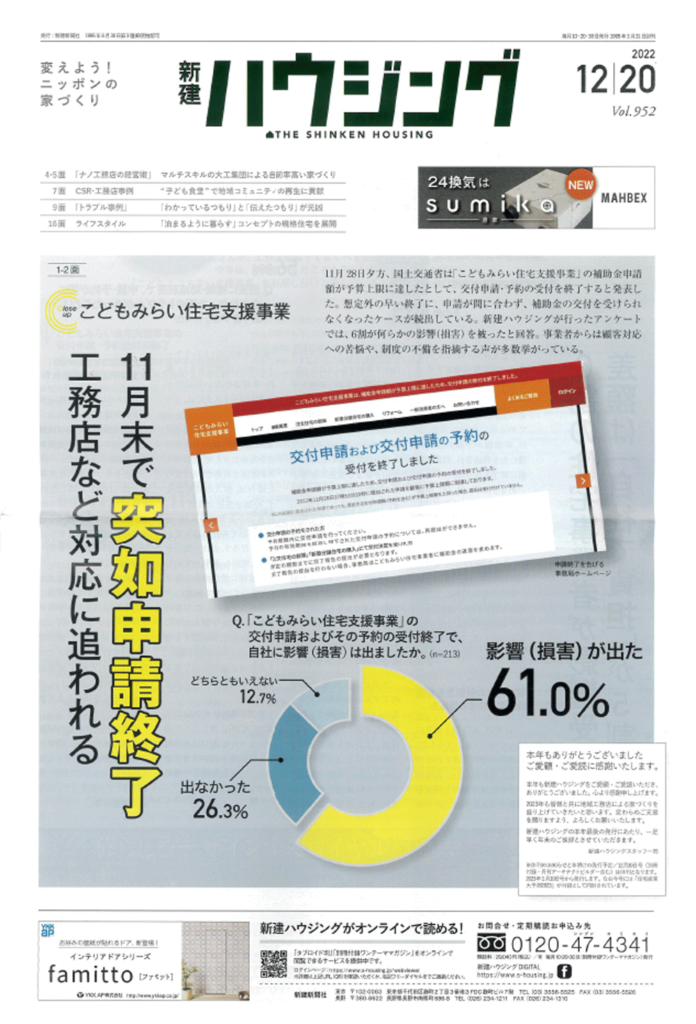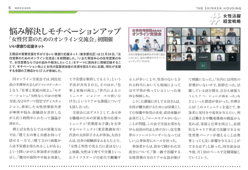 ホーム お知らせ 新建ハウジングに掲載されました 新建ハウジングに掲載されました 2022.12.21 お知らせ 先日開催した「女性住宅営業のためのオンライン交流会」の取材記事が新建ハウジング2022.12.20(Vol.952)号に掲載されました。 当日の様子はコチラからご確認ください 追伸 来年2023年以降も定期的に開催予定です。詳細が決まり次第、本サイトや弊社のメールマガジンなどでお知らせいたします。 関連