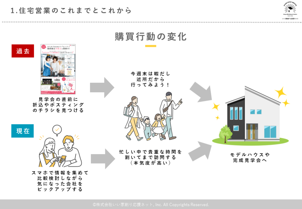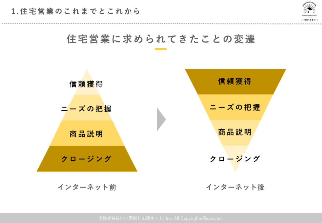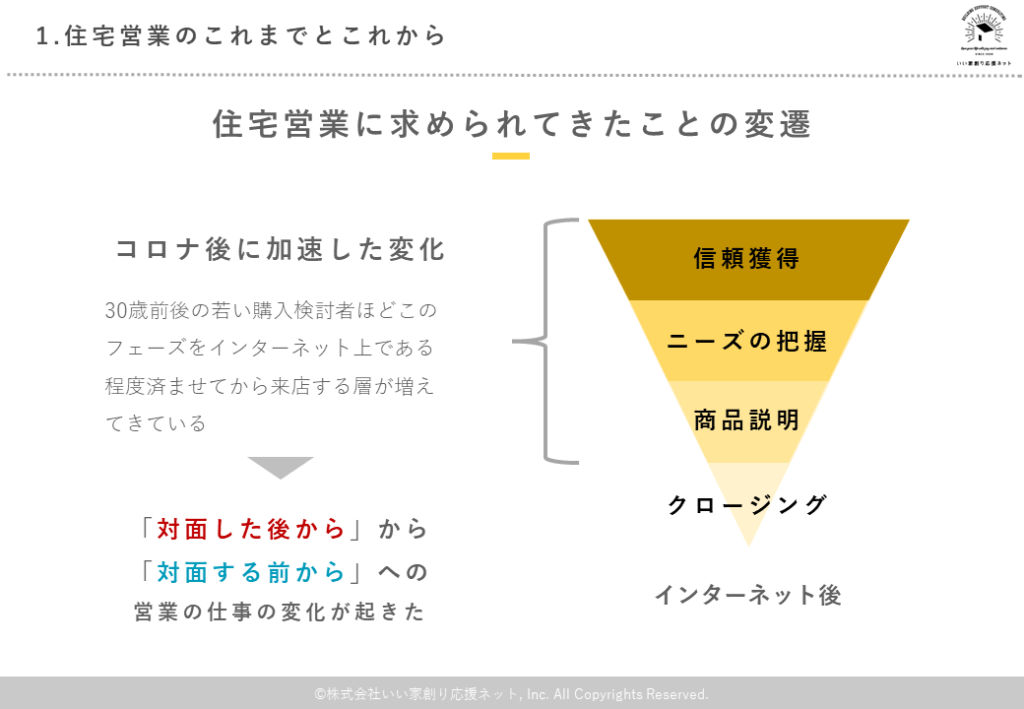 コロナ禍が終息に向かう中、この約3年で住宅会社の集客と営業は一変しました。正確に言えば数年前から言われていた「インターネットを使った集客」「モノ売りからコト売り」「お客様との知識格差の縮小」などが一気に進んだわけです。