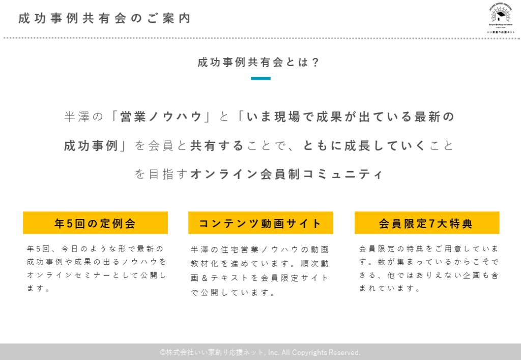 そしてもう一つが、弊社主催で現在50社を超える工務店や個人が参加している「成功事例共有会」を最後にご案内させていただき、興味がある方にはご参加いただけたら嬉しいからです。