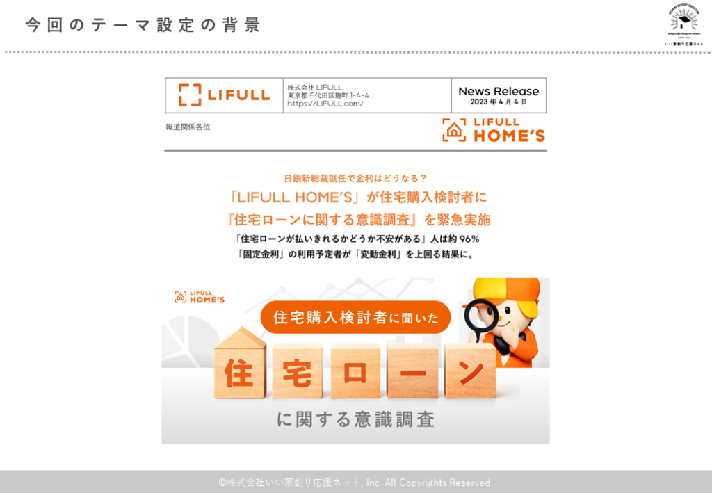 主催であるLIFULL様が2023年4月にリリースした住宅購入検討者向けの意識調査でも、9割を超える方が住宅ローンの支払いに不安を感じています。