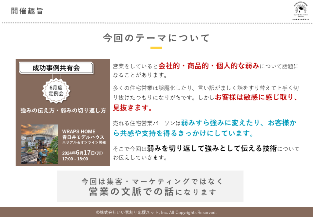 当日はWRAPS HOMEの事業責任者の方にも同席いただき、規格住宅・平屋・ジャパンディスタイルなどのトレンドについての営業的な観点からの解説や、魅力の伝え方などをご紹介いたします。