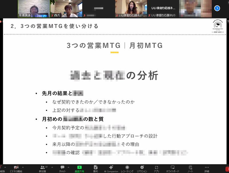 - ミーティングの進め方、月初月中月末に行うミーティングの内容の気をつけるべきポイントを再認識できました