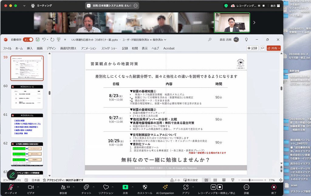弊社の会員コミュニティである「成功事例共有会」の会員限定で、日本制震システム代表取締役の吉岡様をゲストに迎えた全3回の無料勉強会の最終回を開催しました。