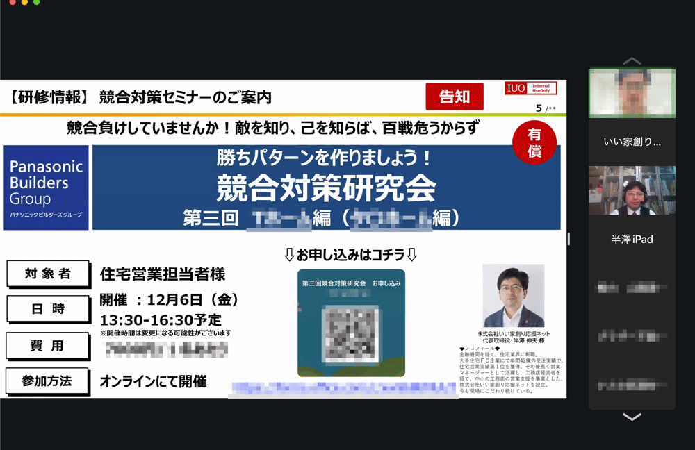 当日は耐震住宅工法テクノストラクチャーの家の強みを振り返りつつ、競合の特徴や営業手法を解説したのち、具体的な対策方法をお伝えさせていただきました。