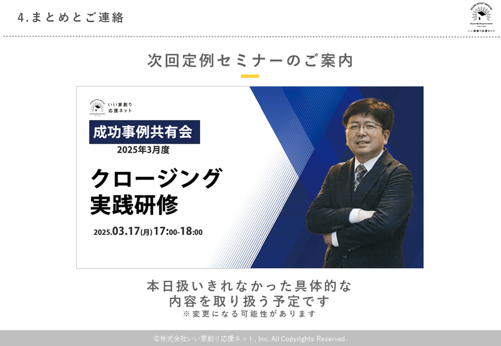 実は次回3月の定例セミナーも「クロージング」を取り上げます。今回お話しきれなかったセールスステップごとのセミクロージングや契約までの布石の打ち方、具体的な事例とトークスクリプトなどさらに実践的な内容をお伝えする予定です。