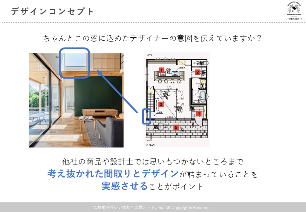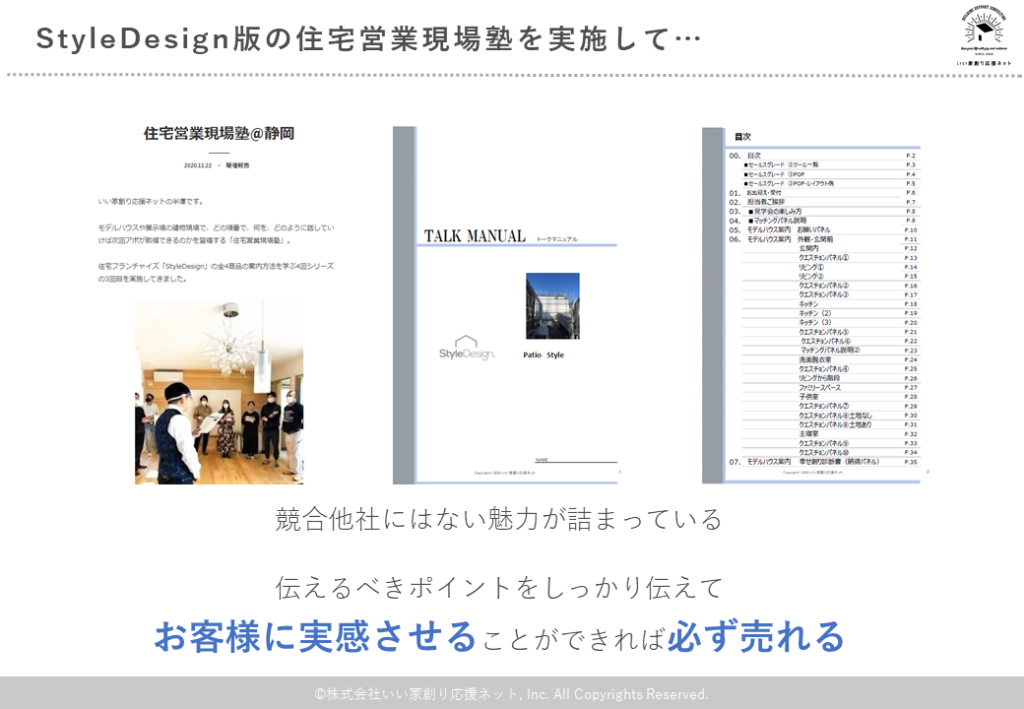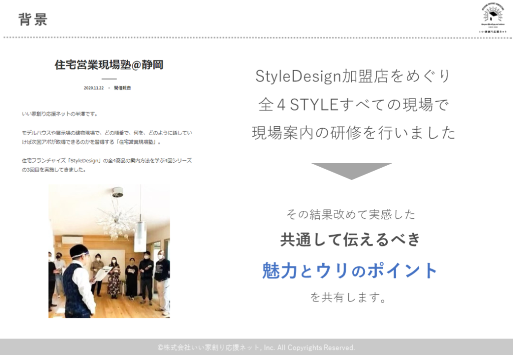 加盟したばかりの工務店様を中心に、全4Styleすべてを建築した経験のない加盟店様に向けて、各商品に共通する「デザインコンセプト」の魅力やウリのポイント訴求を効果的に行う具体的な方法を解説しました。