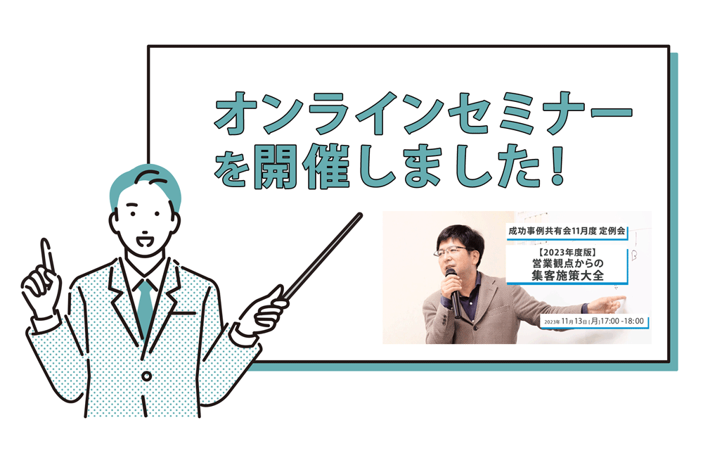 成功事例共有会の定例セミナーを開催しました 2023.11.13 開催報告 弊社が主宰する成功事例共有会の3大コンテンツのうちの1つである「定例セミナー(11月度)」を開催しました。ちなみに今回で年内は最終回となりました。 テーマは「営業観点からの集客施策大全」でした。 2023年5月~11月の…