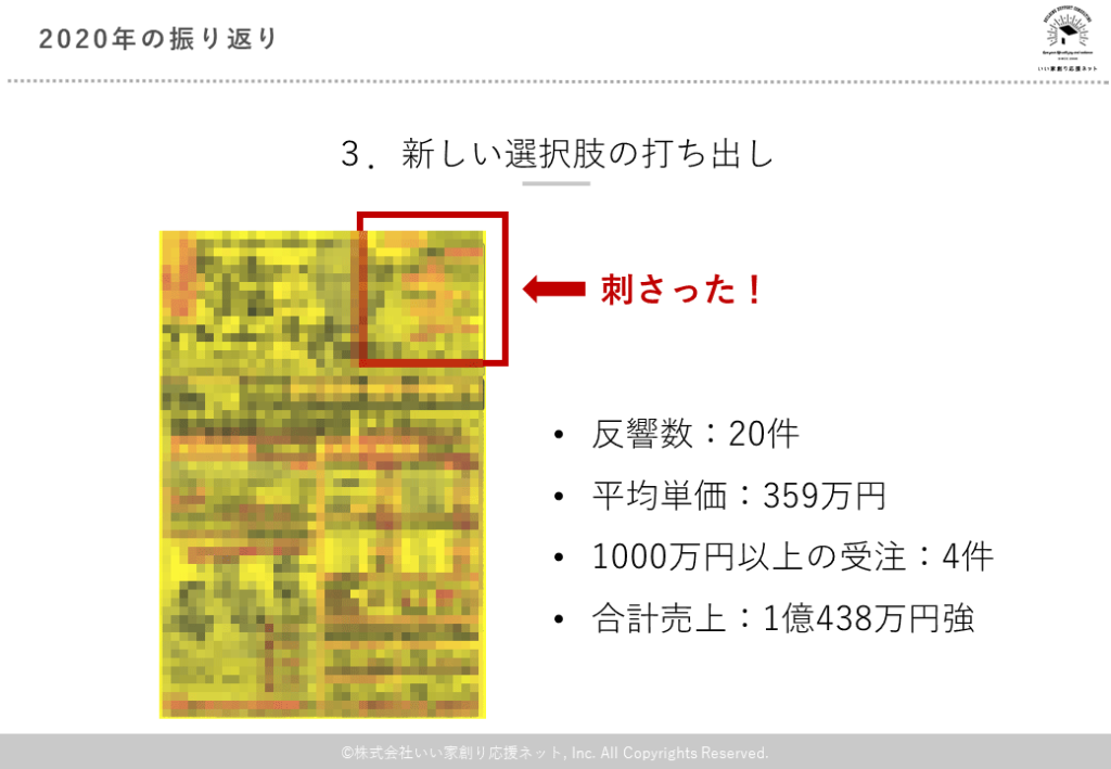 さらに成功事例の共有パートでは、リフォームや建て替え需要を喚起して大成功したチラシの事例や、新人や若手営業パーソンの最速戦力化の事例など5つの成功事例を実例や数字データをもとにお伝えしました。
