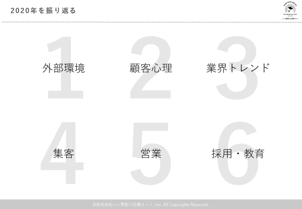 今回のテーマは『2020年の成功事例総まとめ&2021年の展望と対策』と題して全6分野ごとに振り返りと来年の展望と対策をお伝えしました。