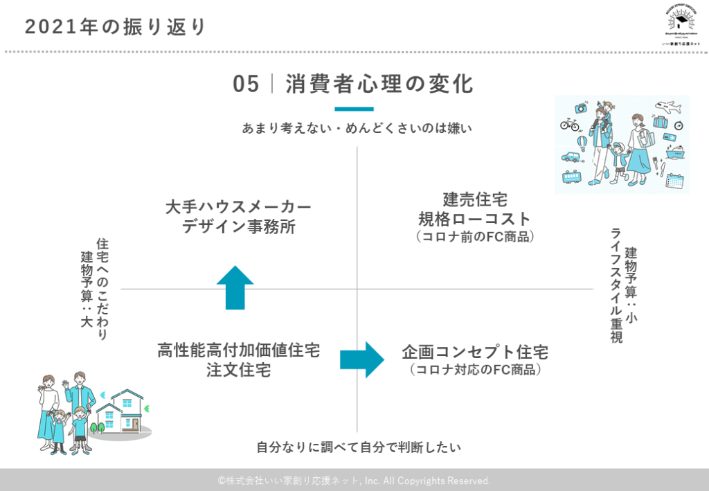 単価を上げてデザインや性能や健康などをアピールしてきた高性能高付加価値住宅のゾーンにいた消費者は、安定志向から大手ハウスメーカーに流れるか、またはコロナにより生まれた新しい住宅ニーズに対応した企画コンセプト住宅のどちらかに流れていくと考えられています。