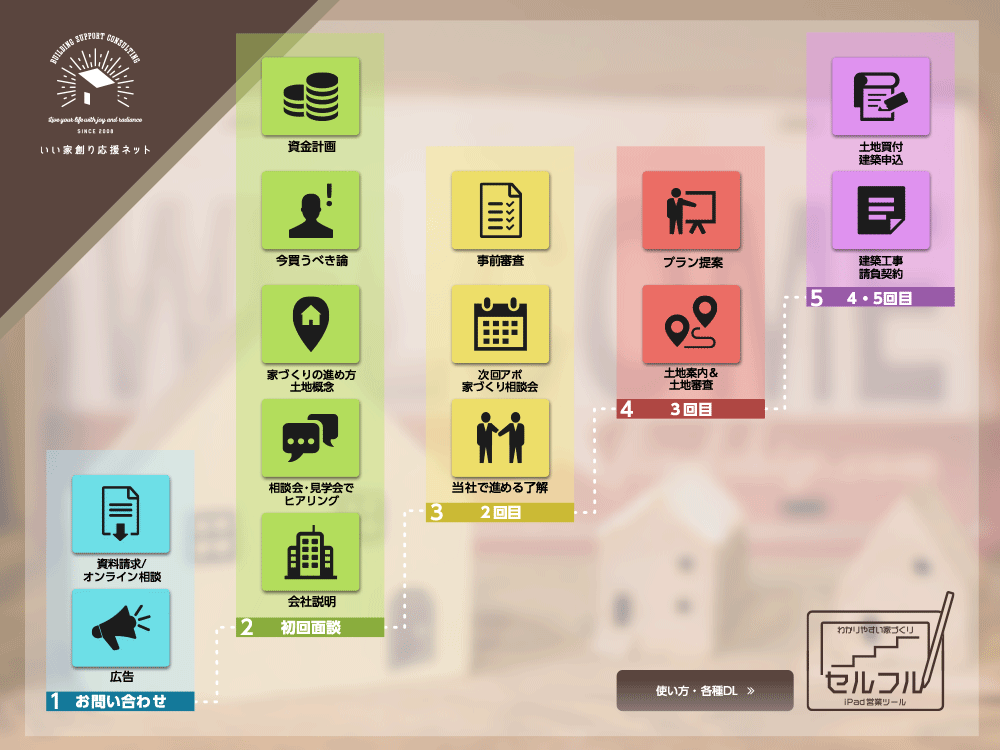 セルフルは家づくりを始めたばかりのお客様でもパッと一目見て理解できるような構成とビジュアルがまとまっているトコトン親切な営業ツールになっています。