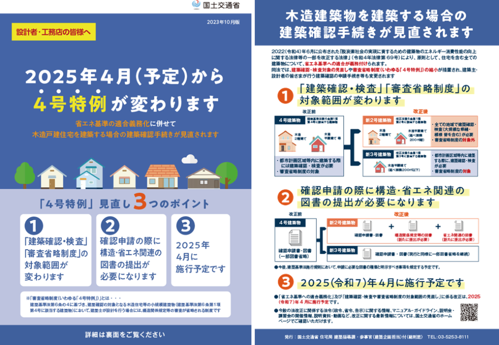 2025年の法改正では、4号特例が縮小されます。これは、これまで建築確認が不要だった一部の木造住宅にも確認申請が必要になることを意味します。
