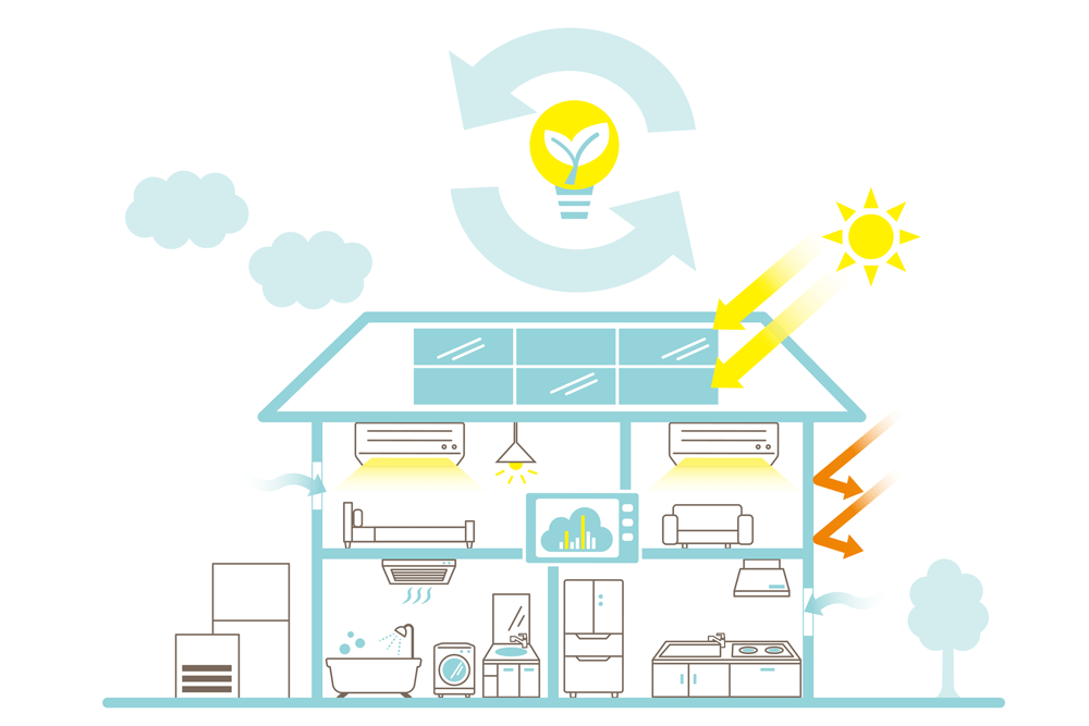 具体的には、高断熱・高気密でUA値を0.6以下に抑えたり、省エネ設備(高効率なエアコンや給湯器など)を取り入れることが求められます。さらに、発電設備を設置することでエネルギーを自給自足します。