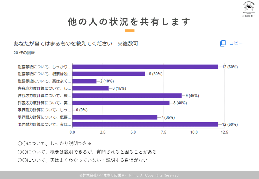 耐震等級はそれなりに説明できているものの、許容応力度計算に関しては95%の参加者が「お客様に質問されたら困る」「実はよくわかっていない」という結果でした。