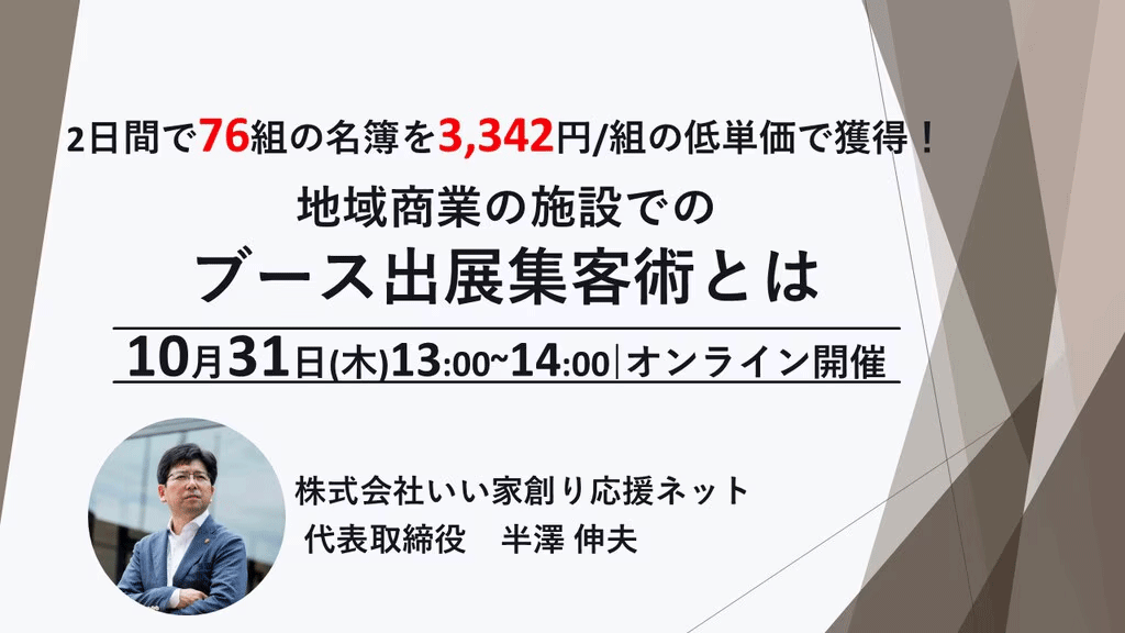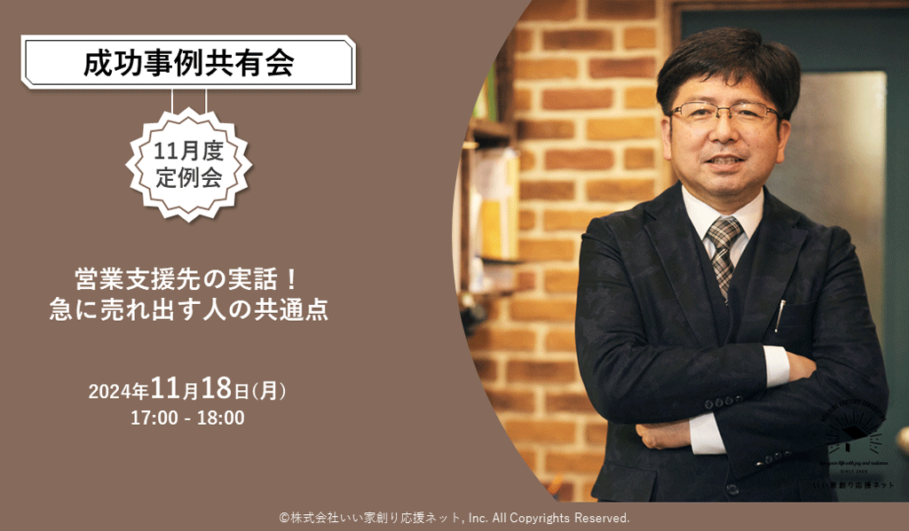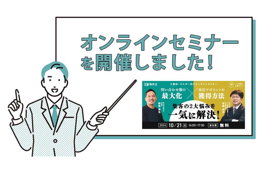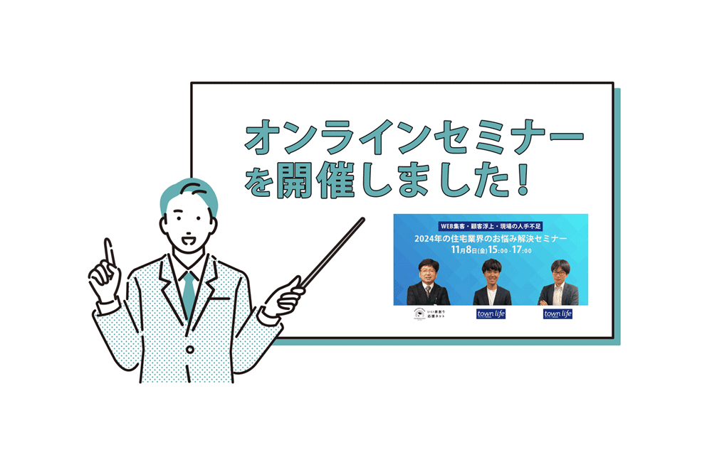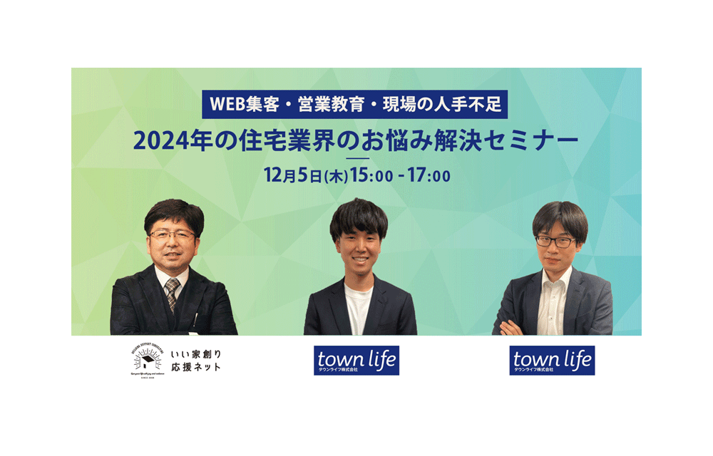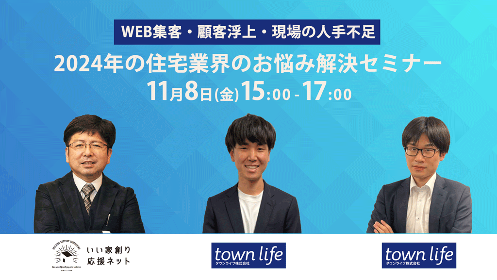 【無料】WEB集客・顧客浮上・現場の人手不足…2024年の住宅業界のお悩み解消セミナー 2024.11.01 開催予告 昨年も好評だった【タウンライフ】×【いい家創り応援ネット】のコラボセミナーがアップデートして帰ってきました。 今回は2024年の今、住宅会社や工務店からの相談が多い「集客」「営業」「人手不足」の各テーマに対して (SNS…