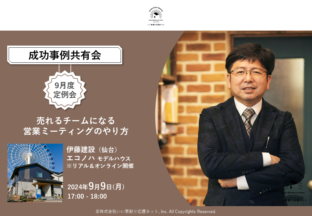 売れるチームの営業ミーティングのやり方 2024.09.11 開催報告 弊社が主宰する成功事例共有会のメインコンテンツのうちの1つである「定例セミナー」を開催しました。 今回は会員企業で仙台を中心に高性能かつ木の温もりを感じる家づくりを提供している伊藤建設様のモデルハウスからリアルとオンライ…