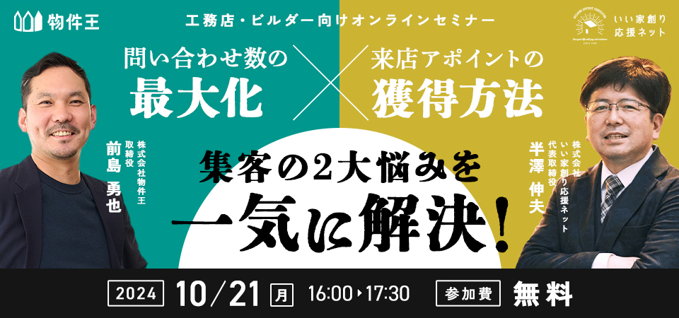 【無料】集客の2大悩みを解決する方法 2024.09.29 開催予告 2024年の現在はデジタルネイティブ世代が住宅を購入する世代になるタイミングであり、コロナによる消費行動の変化が完全に定着しました。 そのため以前から自社サイト・SNS・ネット広告に力を入れてきた企業だけが集客できる時代…