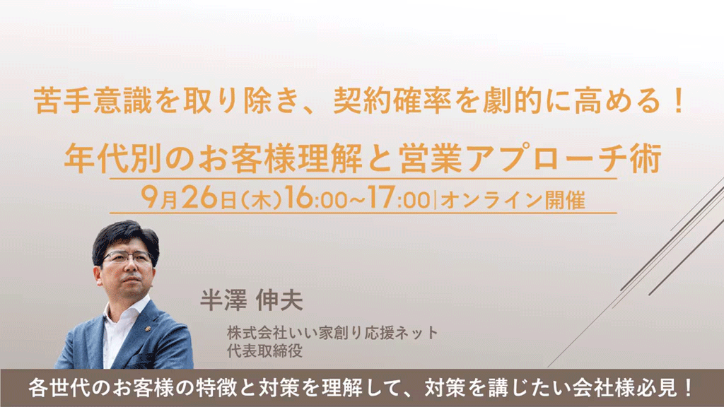 【無料】苦手なお客様を克服して契約率を劇的に高める方法 2024.09.14 開催予告 今回のLIFULL様が主宰するセミナーにゲスト登壇してお伝えする内容は、過去に有料セミナーや会員向けセミナーでのみお伝えした内容を一部変更してお届けする予定です。 https://iezukuri-business.ho…
