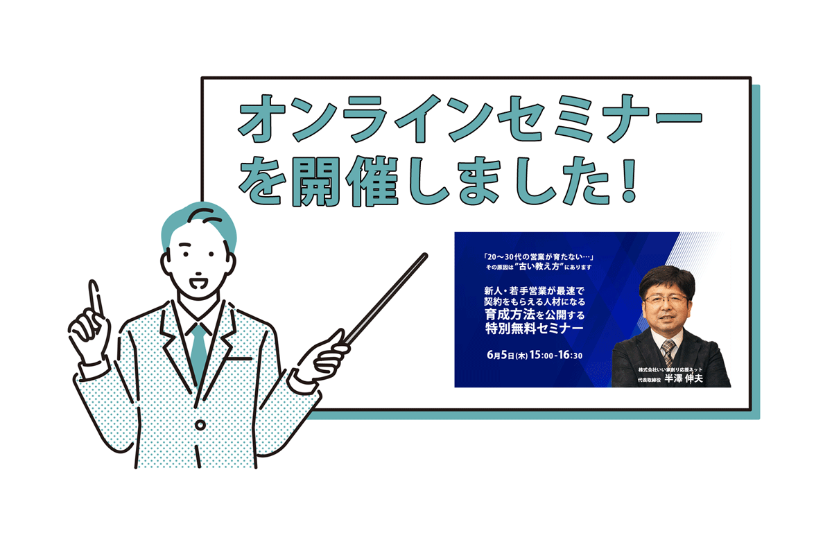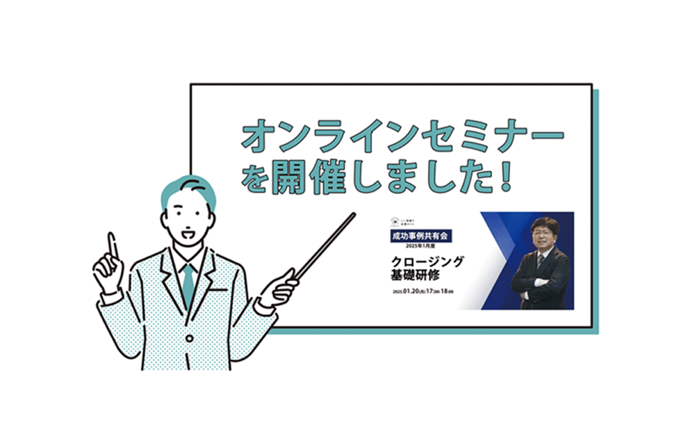 成功事例共有会の定例セミナーを開催しました 2025.01.21 開催報告 弊社が主催する「成功事例共有会」の3大コンテンツのうちの1つである「定例セミナー」を開催しました。 今回は昨年末のアンケートで最も興味関心が高かった「クロージング」についてお伝えさせていただきました。 久しぶりに90名を…
