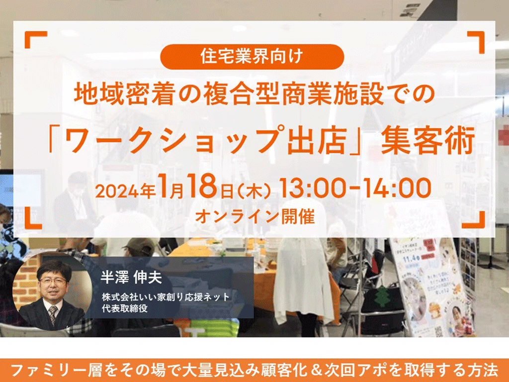 ホーム LIFULL LIFULL 【無料】自社で効果的な競合対策を実施する方法 2025.04.04 開催予告 日本最大級の不動産・住宅情報サイトを運営している株式会社LIFULLと弊社のコラボレーションセミナーの参加申し込みがスタートしています。 今回の無料セミナーでは営業的観点からの競合対策を実施することで、効果的な対策を講じ… LIFULL様主催セミナーに登壇しました 2024.11.02 開催報告 日本最大級の不動産・住宅情報サイトを運営している株式会社LIFULL様が主催するセミナーにゲスト講師として登壇しました。 今回はLIFULL様の担当者からのリクエストで「苦手なお客様を克服して契約率を劇的に高める方法」を… 【無料】弊社の集客商品のノウハウを無料公開します 2024.10.24 開催予告 日本最大級の不動産・住宅情報サイトを運営している株式会社LIFULLと弊社のコラボレーションセミナーの参加申し込みがスタートしています。 今回の無料セミナーでは弊社の商品である『1Dayイベント集客パック』の裏側とコアノ… LIFULL様主催セミナーに登壇しました 2024.09.27 開催報告 日本最大級の不動産・住宅情報サイトを運営している株式会社LIFULL様が主催するセミナーにゲスト講師として登壇しました。 今回はLIFULL様の担当者からのリクエストで「苦手なお客様を克服して契約率を劇的に高める方法」を… 【無料】苦手なお客様を克服して契約率を劇的に高める方法 2024.09.14 開催予告 今回のLIFULL様が主宰するセミナーにゲスト登壇してお伝えする内容は、過去に有料セミナーや会員向けセミナーでのみお伝えした内容を一部変更してお届けする予定です。 https://iezukuri-business.ho… LIFULL様主催のコラボセミナーに登壇しました 2024.01.18 開催報告 日本最大級の不動産・住宅情報サイトを運営している株式会社LIFULL様と弊社のコラボレーションセミナーで登壇しました。 今回はLIFULL様の担当者からのリクエストで「集客」をテーマに弊社の事例とノウハウを公開しました。… LIFULL様主催のコラボセミナーに登壇しました 2023.09.21 開催報告 日本最大級の不動産・住宅情報サイトを運営している株式会社LIFULL様と弊社のコラボレーションセミナーで登壇しました。 今年3回目のテーマはLIFULL様の担当者からのリクエストで「住宅ローン」をテーマに開催しました。 … LIFULL様とのコラボセミナーに登壇します 2023.09.11 開催予告 日本最大級の不動産・住宅情報サイトを運営している株式会社LIFULLと弊社のコラボレーションセミナーの参加申し込みがスタートしています。 今回の内容は『住宅ローン』についてになります。 なぜ住宅ローンの話が大事なのか? … 【2か月連続】LIFULL様とのコラボセミナーに登壇します 2023.05.02 開催予告 2か月連続での開催となる、日本最大級の不動産・住宅情報サイトを運営している株式会社LIFULLと弊社のコラボレーションセミナーの参加申し込みがスタートしました。 今回の内容は『資金計画』についてになります。 住宅営業が信… LIFULL様とのコラボセミナーに登壇します 2023.04.04 開催予告 日本最大級の不動産・住宅情報サイトを運営している株式会社LIFULLと弊社のコラボレーションセミナーが決まりました。 今回の内容は『反響営業』です。 実は「反響営業」に関しては2022年9月の成功事例共有会の定例会で、一…